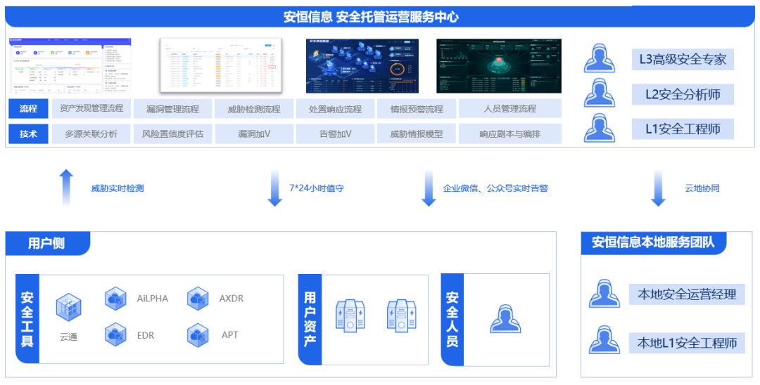 7*24小时在线的云端三级安全运营专家以及分布在全国各城市的本地服务团队,通过云端托管运营服务平台实现用户侧安恒边界、流量、终端设备的托管,并按照资产发现、暴露面检测、互联网漏洞扫描与管理、威胁实时检测响应等运营流开展工作。