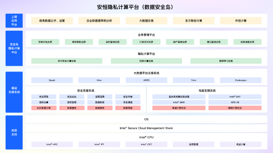 在性能支撑系统中,安恒隐私计算平台的架构设计中包含两个部分:首先,对于密码计算任务,使用Intel的密码加速能力组件,如AES-NI指令集、Intel® QAT加速卡等,给密码算法与基于密码算法的各种应用提供加速服务。其次,对于普通计算任务,特别是大数据、深度学习相关的任务,可以采用Intel下一代至强平台内置的Intel® AMX加速引擎为业务系统的性能提供优化。