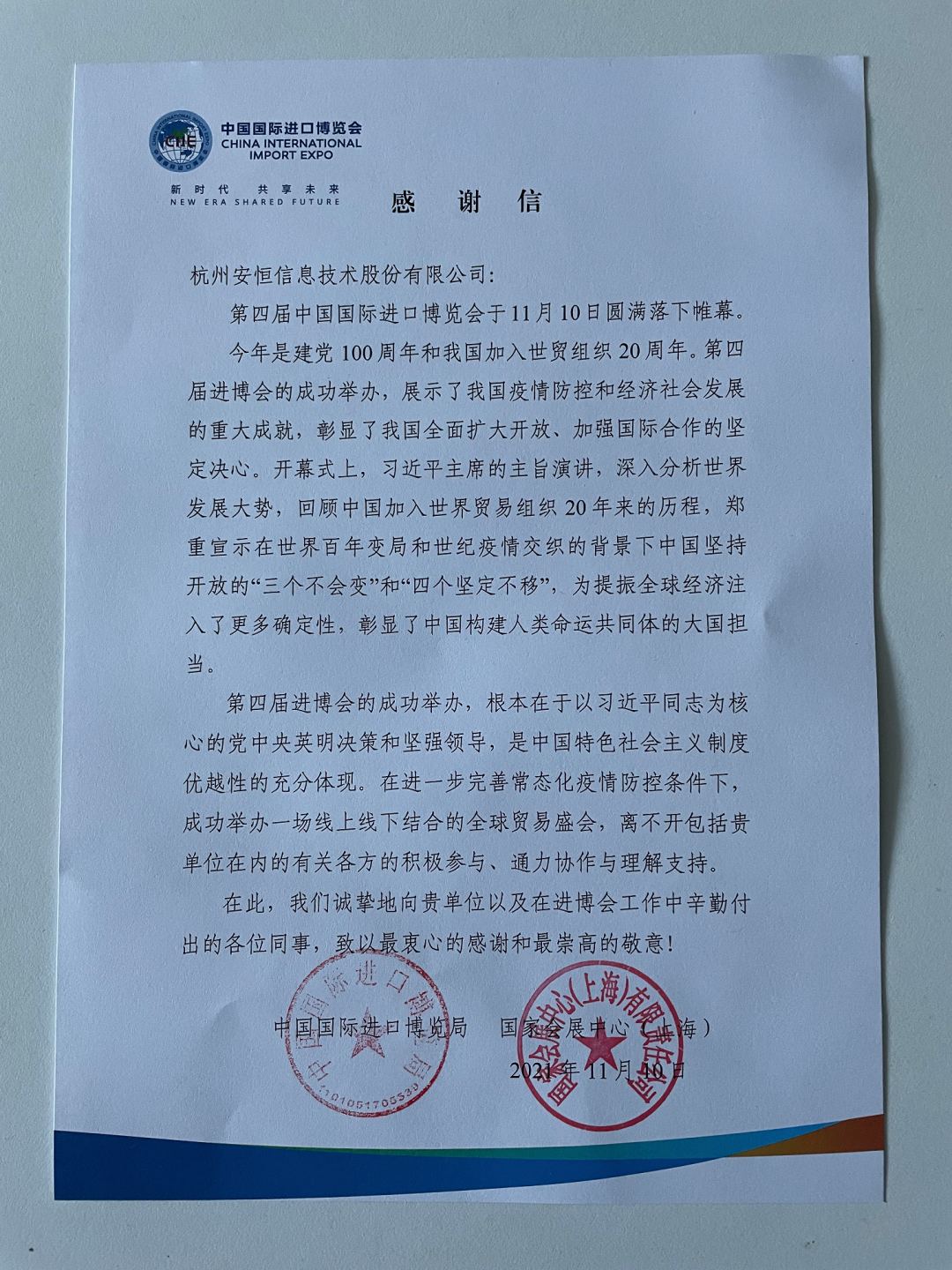 对此,中国国际进口博览局、国家会展中心(上海)有限责任公司特地发来感谢信,向安恒信息致以最衷心的感谢和最崇高的敬意!