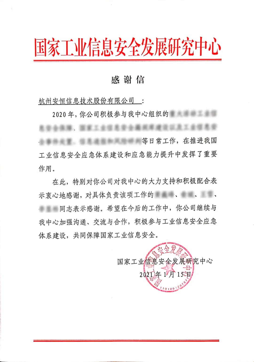 荣耀二连!安恒信息连续两年收到「国家工业信息安全发展研究中心」感谢信