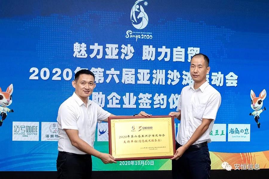 10月10日,2020年第六届亚洲沙滩运动会赞助企业签约仪式于三亚举行,安恒信息与三亚亚沙会组委会签署赞助协议——安恒信息正式成为“2020年第六届亚洲沙滩运动会支持单位(信息技术服务类)”。