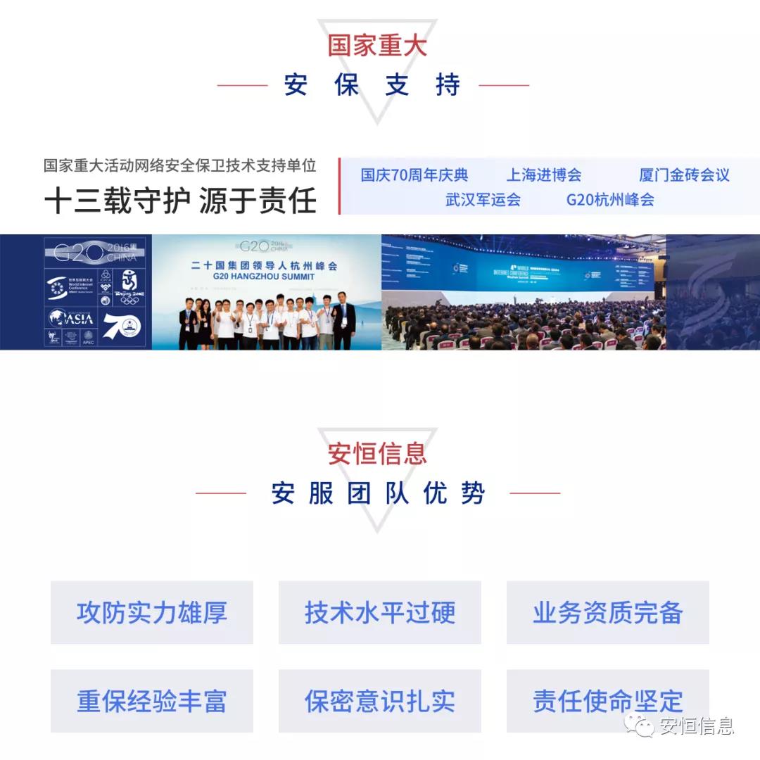 通过一次次重大体育赛事网络安保的历练,安恒信息也构建起了科学、专业、全方位的网络安保服务体系,并在行业内真正建立起一支专注服务于大型体育赛事、国际性展览会议的精英队伍,致力于成为一家具有优秀企业文化和社会责任感的新时代网络信息安全产品和服务提供商。