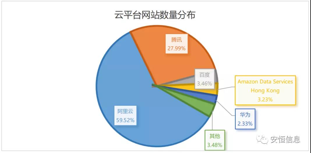 2020年,累计监测发现云平台上中大型单位的网站与Web业务系统数量有6507161个,覆盖单位604614个,主要是阿里云网站和腾讯云网站,分别占比59.52%和27.99%。