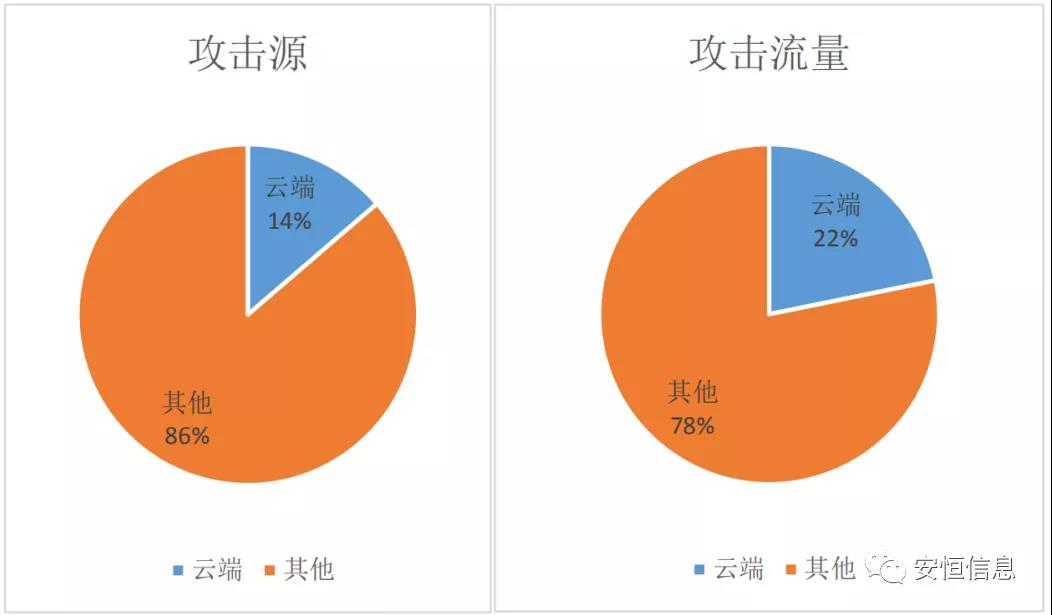 在攻击峰值在100Gbps以上的大型攻击中,来自云端的攻击占比77%。