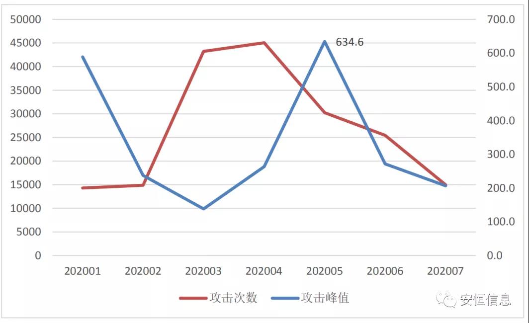 从上半年各月来看,云端攻击源数量逐月上升,从攻击次数来看,3/4月份为云端DDoS攻击高峰,从攻击峰值来看,5月峰值最高为634.6Gbps。