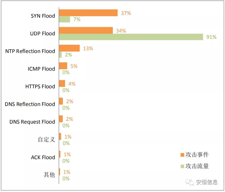 从攻击类型来看,云端DDoS主要的攻击类型是SYN Flood,占总攻击次数的37%。从流量占比来看,UDP Flood发起的攻击流量占比最高,占比91%。