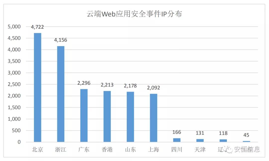 根据对存在安全事件的云端Web应用IP所在区域进行分析,发现主要分布在北京、浙江、广东等区域。
