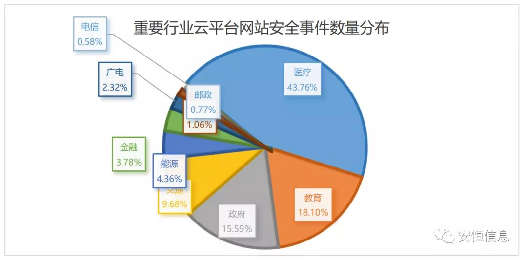 存在安全事件的云平台网站中,有1033个为重要行业网站。主要受影响的重要行业为医疗,占比43.76%,此外教育和政府行业也有一定的影响。