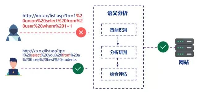 作为OWASP TOP 10中排名靠前的攻击方式,SQL注入、XSS等命令型攻击由于具备极强的灵活性,是Web攻防对抗中是最常被用到的攻击手段之一。传统的基于静态签名特征的防护方式极易被绕过造成未知威胁攻击,下图以SQL注入防护为例简要分析此过程: