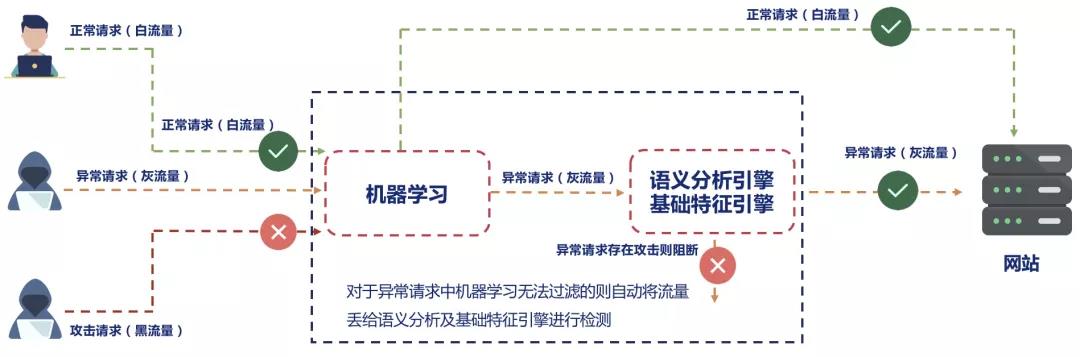 机器学习完成进入检测模式后,依据“量身定做”的安全模型识别黑、灰、白三种不同流量,进而针对安全性的不同采取不同的处理策略,在高效保障正常业务访问的同时,可以有效识别并阻断0day等未知威胁访问,为用户的Web安全保驾护航!