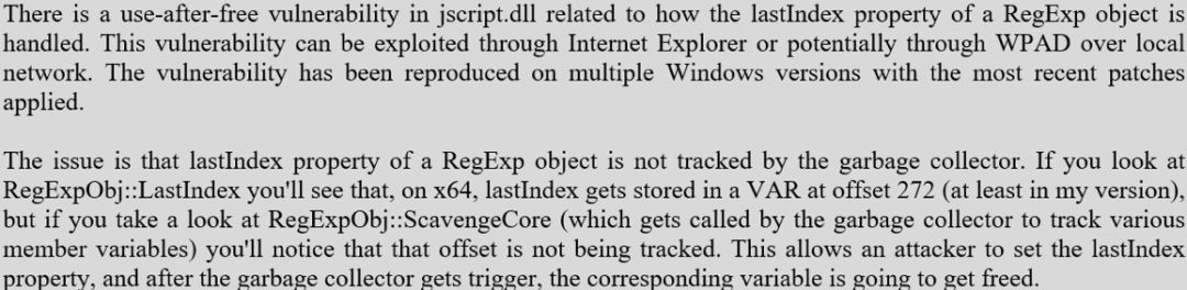 通俗一点说就是RegExp类的lastIndex成员没有被加入GC追踪列表,如果给它赋值,在GC时会导致lastIndex处存储的指针变为悬垂指针。后续再访问lastIndex时,即造成一个典型的Use-After-Free场景。