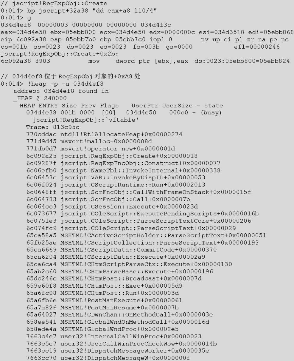 x64与x86的原理一致,以x86的版本进行说明。既然x64环境中对应的i为115。x32环境中,也以115为例进行偏移计算。在上述代码中在第115个RegExpObj对象创建时下断点,相关方法在前面UAF小结已经描述,这个偏移很容易计算得到。