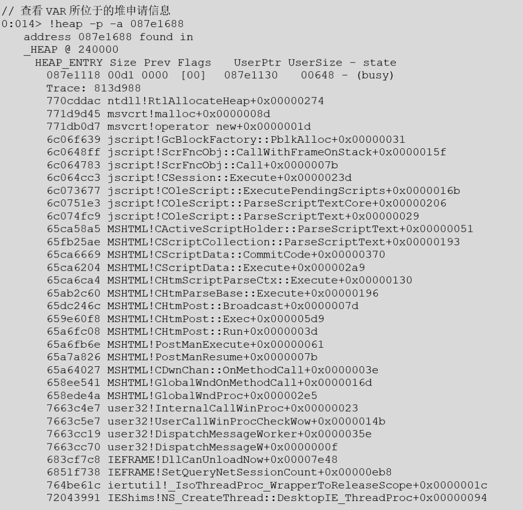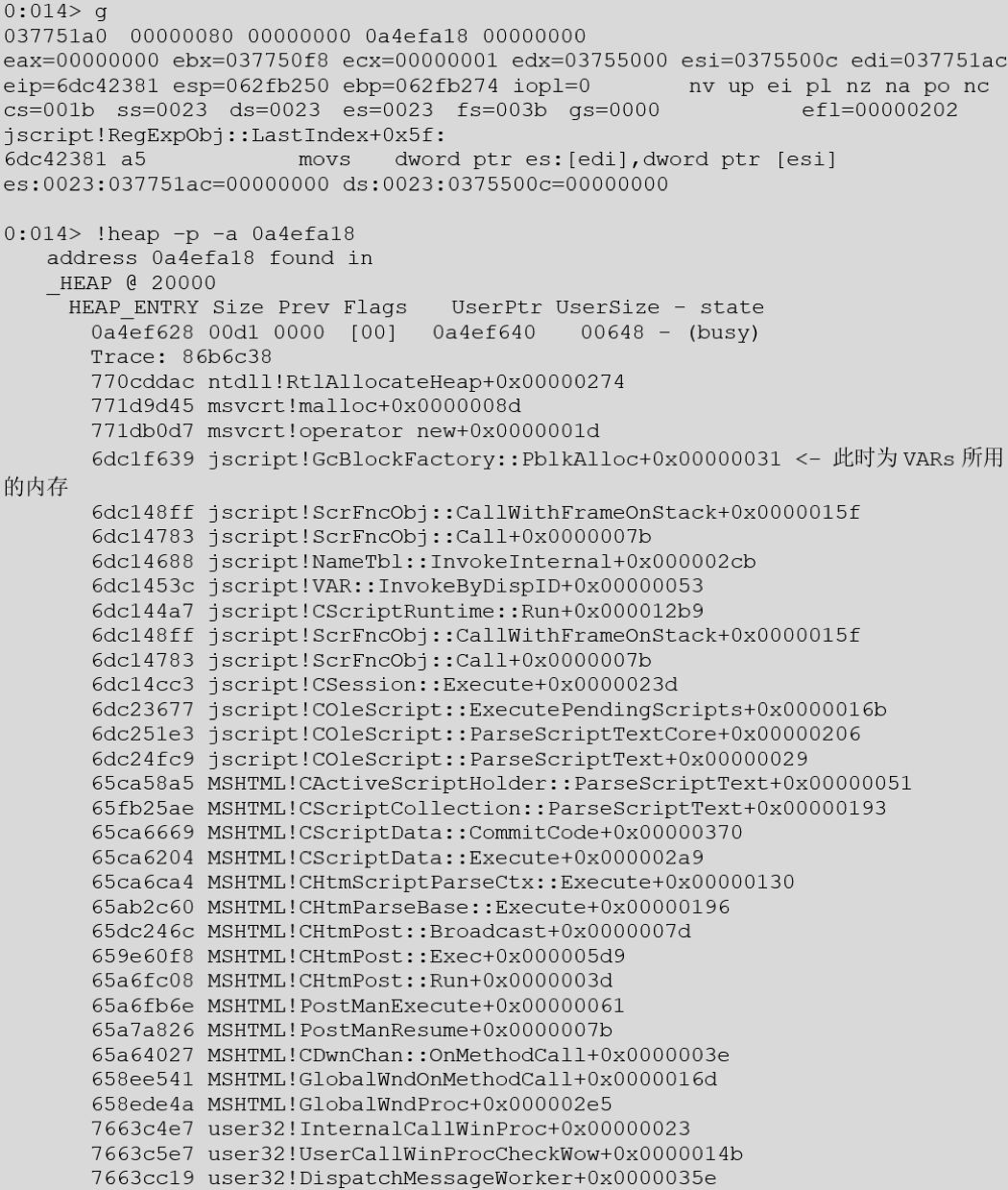从调试日志中可以看出,用来存储VAR变量的内存块是从GcBlockFactory::PblkAlloc申请的,x86下其申请大小固定为0x648(《Garbage Collection Internals of JScript》这篇文章有解释为什么x86下这个大小是0x648):
