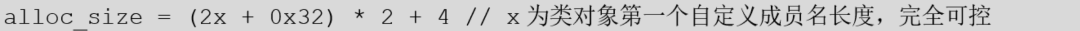 整个计算公式比较复杂,但设计思路很简单,笔者在这里描述一遍,读者大致了解即可:x86下,第一个成员名初始化时,先申请(2x+0x32)*2+4的内存大小,得到内存后,最初的0x30作为头部使用,用来初始化各种数据,包括本次字符串长度,指向下一个成员名头的指针(这个指针会后面的成员名初始化时被更新),然后因为是第一个成员,按照公式直接加4字节进行对齐,所以从前面的调试日志也可以看到,第一个成员名从+0x34开始被复制。只要第一次申请的内存空间够,第二个成员名按照base+offset+4的方式进行内存地址获取,然后前0x30又是头部,接着再开始复制,以此类推。