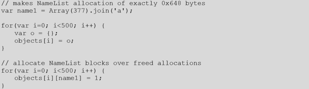 一个比较好的方法是借助NameList。jscript对象在创建成员变量时,如果成员变量的名称过长(谷歌的文章中说这个长度阈值为4),会在NameList::FCreateVval函数内单独申请内存,以存储对应的成员变量,并且会以第一个成员名称的长度去申请特定大小的内存,而相关计算公式是固定的。