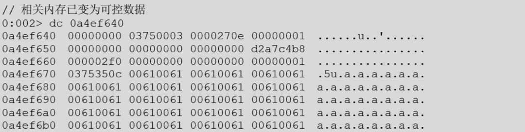 到这里已经将这个UAF漏洞转为了信息泄露,泄露出一块(aaa...部分)完全可控的内存的首地址。如果读者之前看过笔者之前的一篇文章,就会明白这里已经将CVE-2018-8353转换为和CVE-2017-11906具有相同功能的信息泄露漏洞。