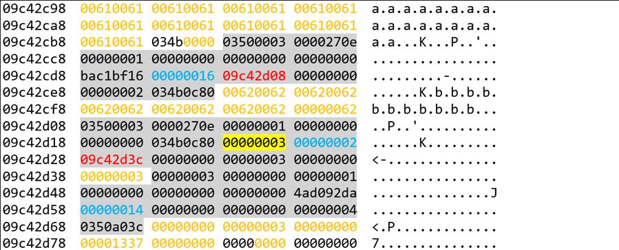 现在来设计name,在每个成员名称初始化时,都会有0x30的头部,在这个头部的+0x24处是一个指针(这个指针要到初始化下一个成员名时才会被初始化),指向下一个变量名的0x30头部,下图中字体为红色的即为这些指针。如果能读取其中一个指针,减去其相对内存起始地址的偏移,就可以得到被重用内存的首地址。