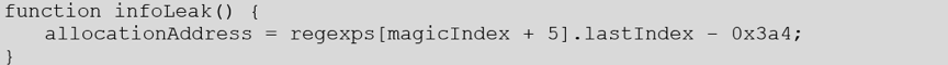 所以,在x86下,如果找到了0x1337对应的regexps[i].lastIndex,就可以通过读取regexps[i+5].lastIndex来泄露相关指针,减去固定偏移就得到被重用内存的起始地址了。如下: