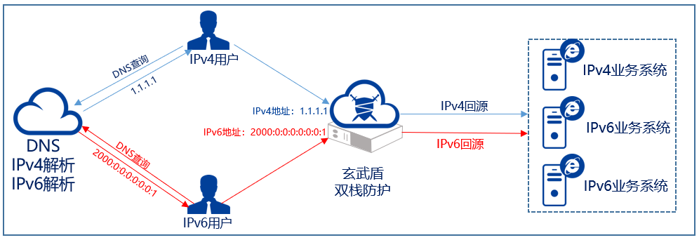 玄武盾全面支持双栈接入,实现IPv4/IPv6双栈转换,为用户提供从IPv4向IPv6的转换升级的快速解决方案。