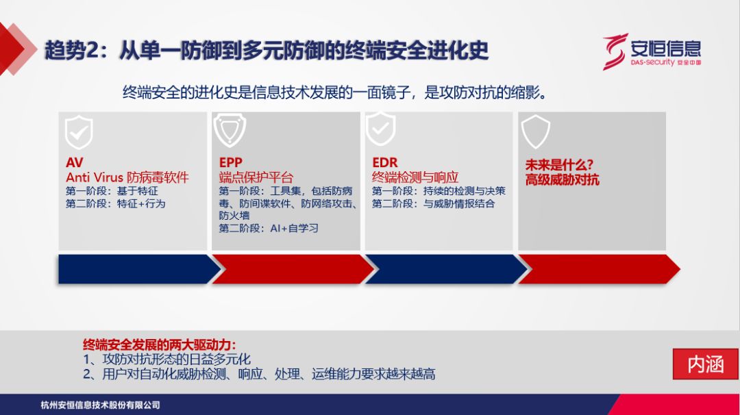 李华生认为,泛终端是未来时代的主流,所有的节点都将是终端,这也正是统一终端的概念。而对于从单一安全防御到更注重威胁发现和自动化处置能力,对自动化威胁检测、响应、处理、运维能力要求越来越高,跨越多级安全层,关联分析各层安全设备的威胁数据,是解决新一代终端安全的关键。