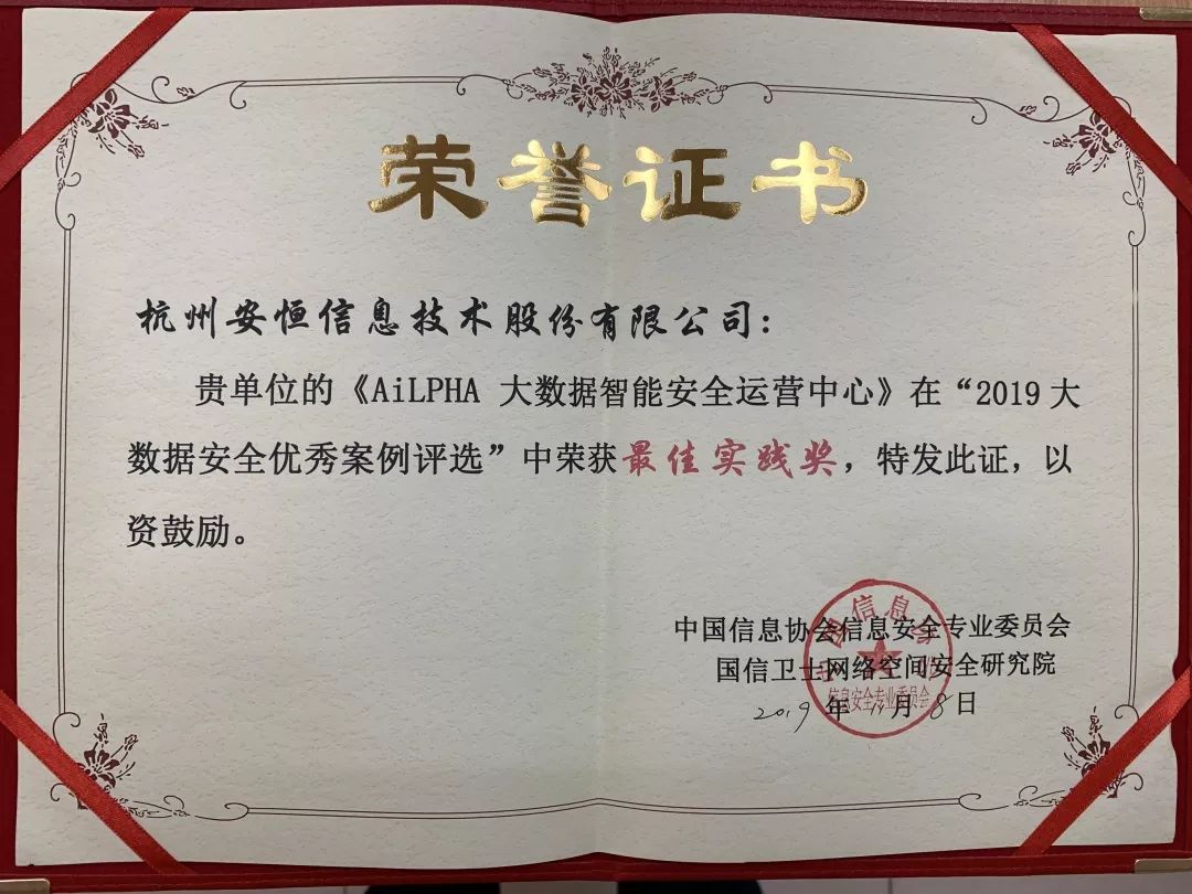 安恒信息AiLPHA大数据智能安全运营中心荣获“最佳实践奖”。