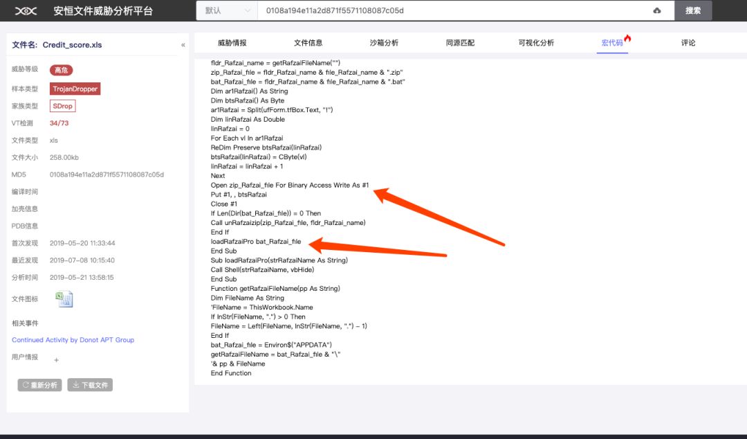 样本文件名: Credit_score.xls ,中文翻译“信用评分.xls”。样本携带恶意的宏代码。由于3个样本的宏代码完全一致,攻击过程主要分析样本0108a194e11a2d871f5571108087c05d的行为。