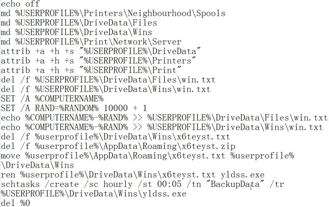 主要目的为创建隐藏文件夹,记录设备基本信息到win.txt,删除自身原文件并移动到当前用户目录%userprofile%\DriveData\Wins下,创建定时任务BackupData 实现持久化。