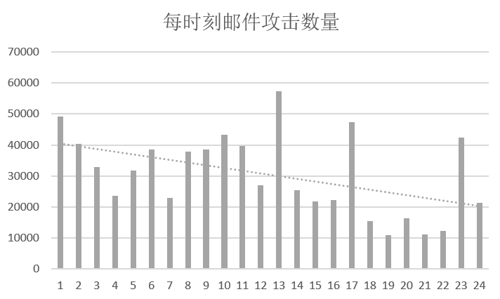 从攻击时刻上分析,一天24小时基本上均有攻击邮件到达,可以判定攻击者多采用自动化的攻击手段,但是国内用户相对在1点~17点期间收到的恶意邮件更多,如图2所示。