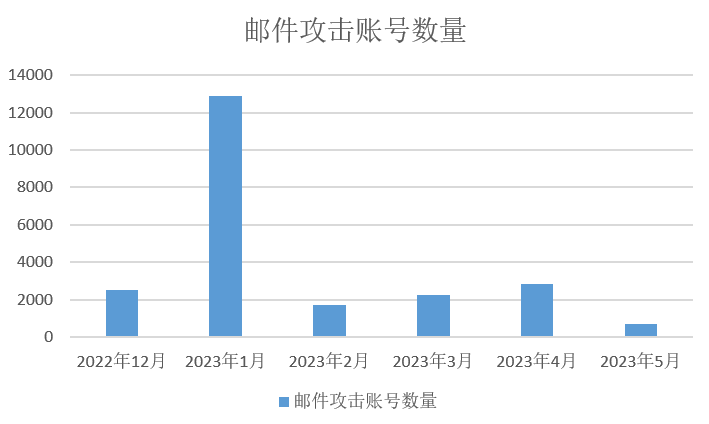 2022年12月至2023年5月期间,安恒信息云监测平台监测到邮件攻击超60万次,这部分的攻击是绕过了邮件安全网关并最终到达用户邮件文件夹的邮件数量,即最终受影响的数量。