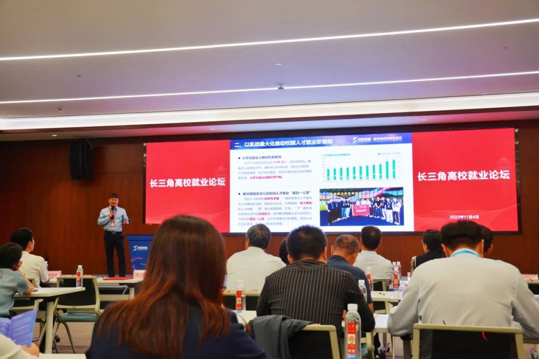安恒信息董事长范渊在交流会上发表致辞,热烈欢迎各领导及长三角高校就业部门负责人的到访,深切表示“人才战略是安恒信息三大战略之一,校园人才战略是公司人才战略的重要组成部分”,并诚挚地向各高校负责人发出“深化校企协同育人,实现应用型人才培养和校企合作共赢”的邀约。