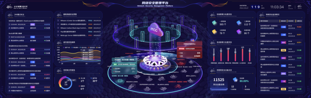 安恒信息AiLPHA态势感知产品线全程深度参与了杭州亚运会的安全保障工作,针对涉亚信息系统的漏洞信息、威胁信息等网络安全态势信息进行统一监控、统一归集、统一分析,助力公安、网信实现了网络安全监测预警、通报处置、整改反馈归口统一、标准一致、结果共享,并实现纵向与市、县,横向与网信、通管、大数据、行业主管部门的数据对接和共享。