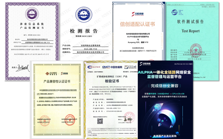 2023年,安恒信息AiLPHA态势感知产品线顺应公司发展趋势,新申请证书资质10余项,通过信通院、各检测机构、各国产化软硬件厂商的各类检测工作,受到业内广泛认可。