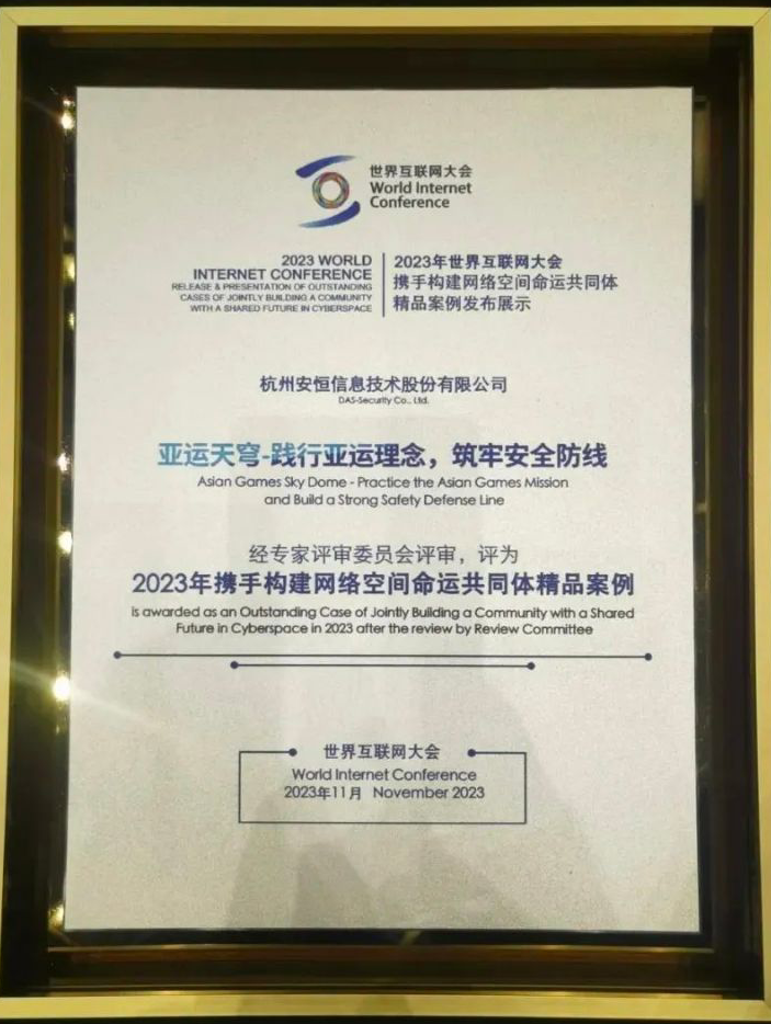 在2023年世界互联网大会期间,“携手构建网络空间命运共同体精品案例”发布展示活动举办,安恒信息携“亚运天穹-践行亚运理念,筑牢安全防线”作为13家精品案例之一精彩亮相,成为本次发布活动中唯一一家国内网络安全企业,同时也是首个二度入选的网络安全单位。
