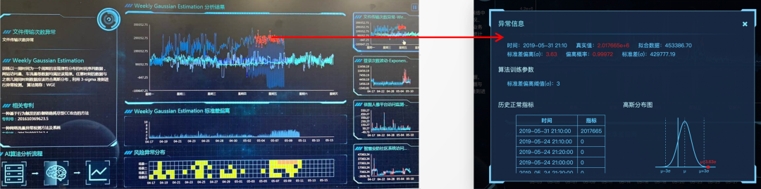 利用Weekly Gaussian Estimation算法历史比对提取周期波动,长期监控企业官网、供应商合作系统等业务系统的访问请求趋势建立访问行为动态基线,实时发现请求中的异常流量,标注异常点,提取相关日志及访问关系,为运营人员提供一步到位的溯源取证能力。