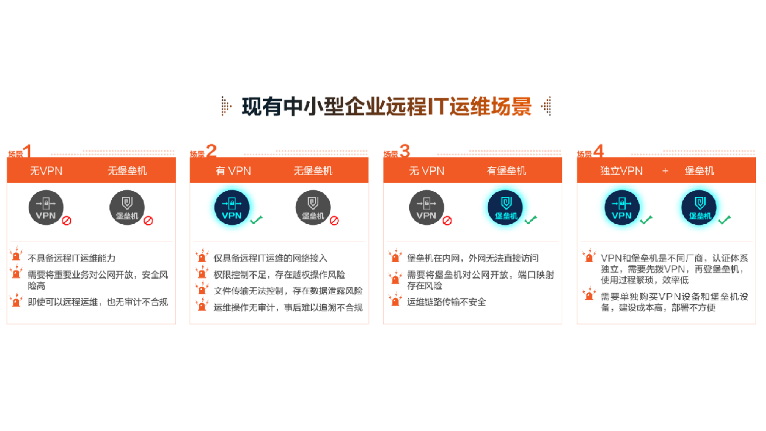 中小型企业,医疗、教育等单位抗风险能力较差,现有安全合规性建设难以满足当前疫情形势下的运维安全,如何降低企业损失,并满足疫情期间的隔离要求,成为各企业单位开展远程办公IT运维安全建设的难题。