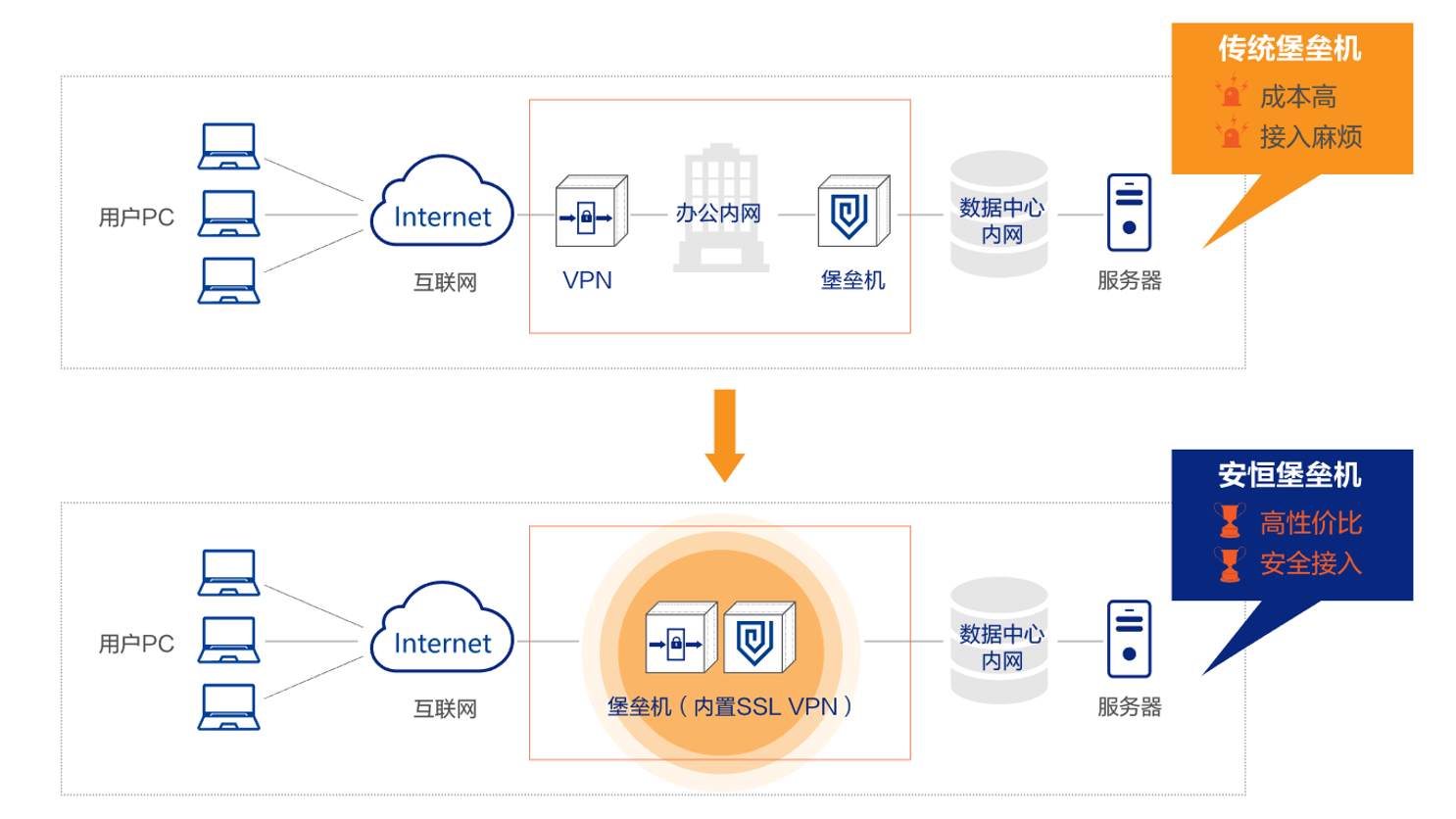 VPN交付: 安恒堡垒机集成了SSL VPN功能模块,只需将VPN服务端口映射互联网,即可实现远程IT运维,保障了远程运维接入安全性的问题,同时通过堡垒机单点登录服务器进行远程运维操作,即解决了外网接入的链路安全,同时保证运维过程的权限控制,操作审计及合规要求。