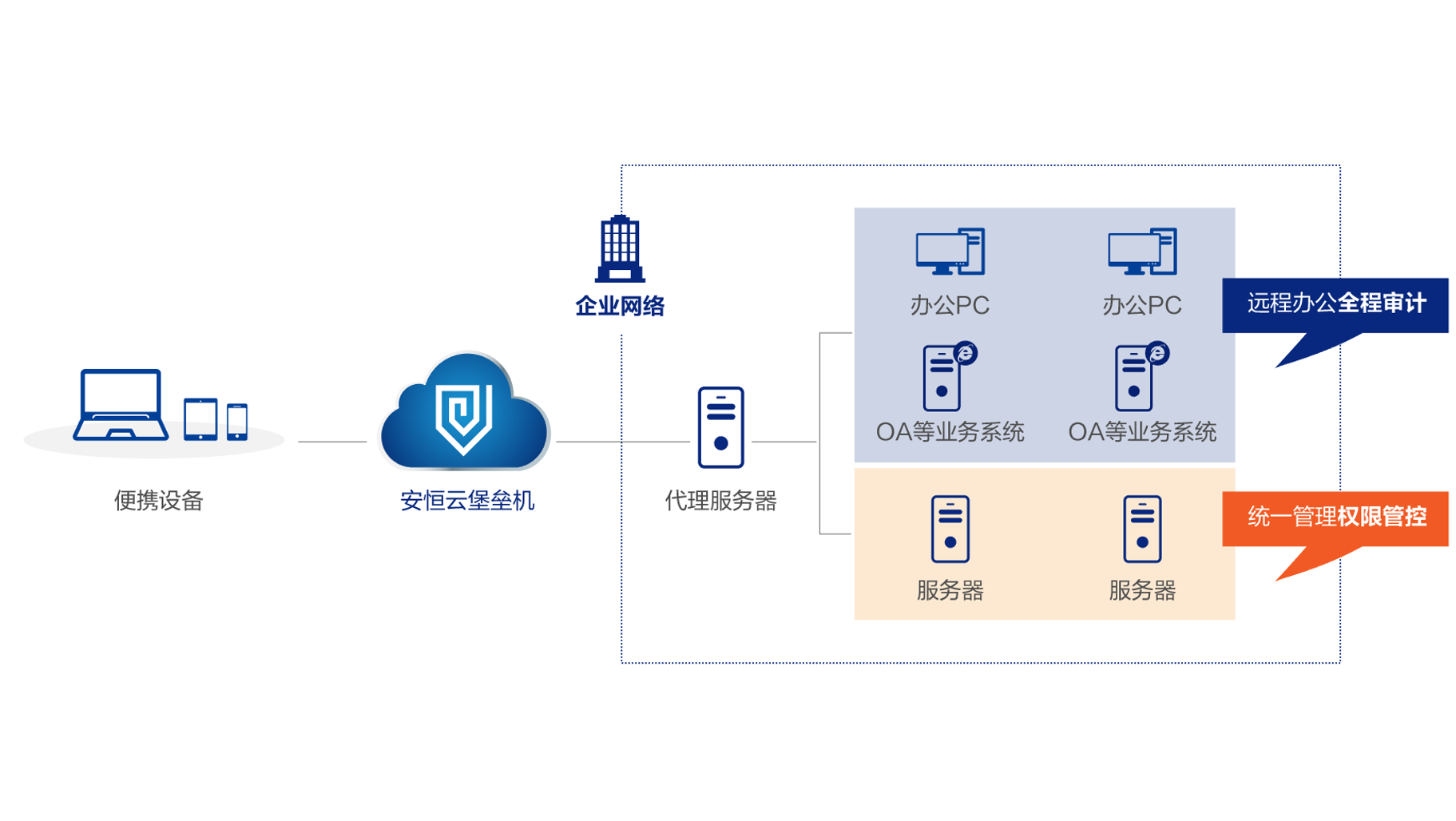 安恒云堡垒+Proxy代理: 云上部署安恒云堡垒机,只需在企业内部局域网中,配置一台Proxy代理服务器,与云堡垒机服务网络互通,即可实现免费的远程IT运维使用。